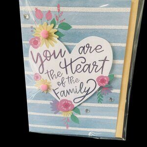 Includes envelope. Beautiful glitter accents and pom-pom flowers. Blank inside for your personal message.