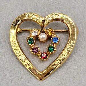 Mother's Day Heart Brooch Dangling Charm Pin Faux Pearl Multicolor Gemstones