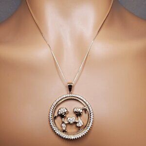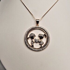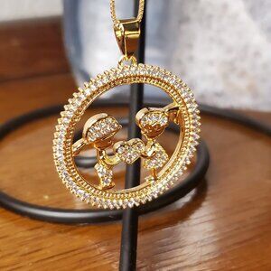 Mother's Day Necklace. Features a Son and Daughter in clear cz crystals, holding a heart between them. Surrounded by a circle of clear CZ. Solid copper with 3 layers of 14k Rose gold.
