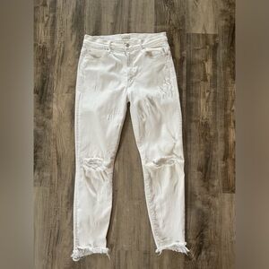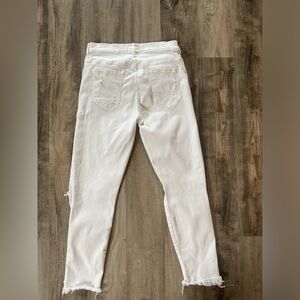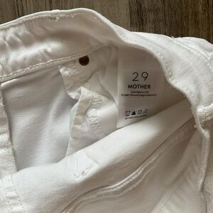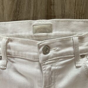 These MOTHER jeans in a crisp white hue feature a skinny fit with stylish distressing at the knees, offering a modern and edgy look. The raw-edged hem adds a touch of casual flair, making them perfect for a laid-back day or a night out.