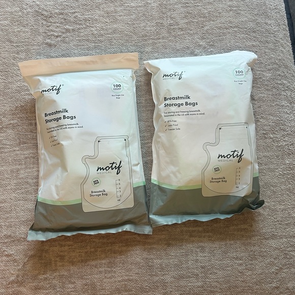 Brand new, sealed packs of Motif Medical Breastmilk Storage Bags — 200 total (two packs of 100). BPA-free, leak-proof, and freezer-safe. Designed for easy, secure storage of breastmilk with a strong double zipper seal.
