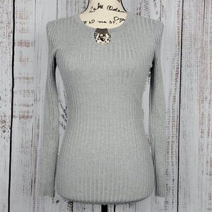 Item: Motive Grey Ribbed Sweater. Super soft and lightweight material. Cute metal emblem on the front. Very figure flattering! Y2K & 90's vibes!