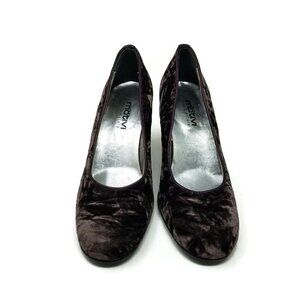 Description: These pumps are unique! They are a mauve crushed velvet which adds texture and catches the light for a slightly luminous effect. Shoes have a block heel and minimal insole padding.