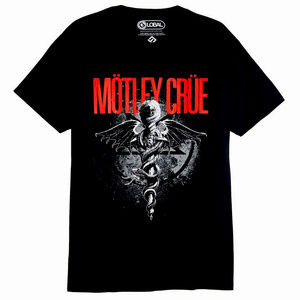 Black T-shirt from Global Merchandising Services with Dr. Feelgood design on the front with Motley Crue Logo over it. 100% heavy cotton.