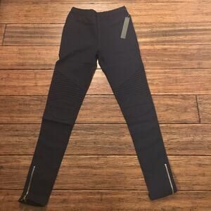 Navy blue stretch biker moto skinny pants. 60% cotton, 35% nylon, 5% spandex. No pockets, elastic waistband, and very stretchy. Zipper ankle detail. Size listed as small as that most closely coincides with measurements. Size L/XL listed as large as that most closely coincides with measurements.