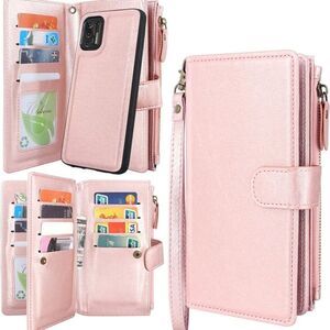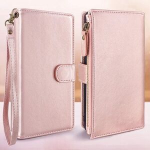 Detachable Magnetic Zipper Wallet Leather Case Cash Pocket with 12 Card Slots Holder Wrist Strap Removable Cover for Moto G Stylus (2021) (Rose Gold)