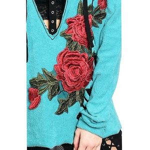 Lovely Oversized Moto Tunic Sweater top, Eye catch trendy Embroidered Rose Patch Embellishment, Hoodie, Distressed stitching, fabric with mesh lining, Open Front Neckline looks sexy with bralette, bandeau or cami underneath, 100% French Terry Cotton, Slouchy fit, Cozy with Relaxed comforts.