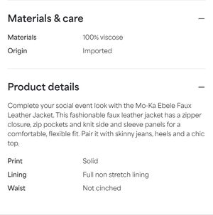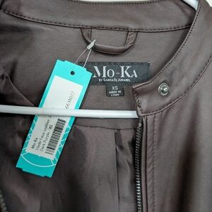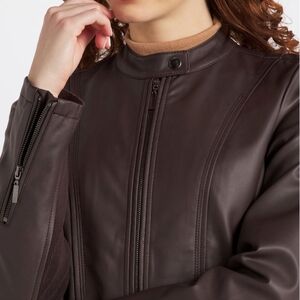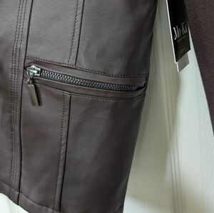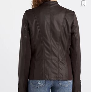 NWT deep mahogany brown faux leather moto style Ebele jacket from StitchFix. Stretchy panels in the sleeves and body make it very comfortable. Functional, zippered pockets at both hips and snap detail at the neck.