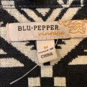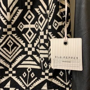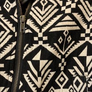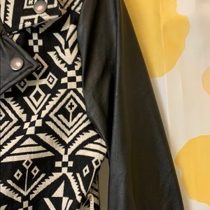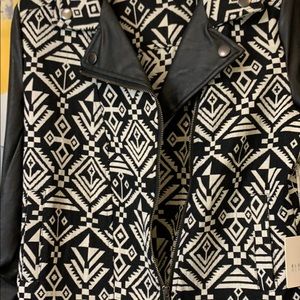 Black and white print. Faux leather sleeves. 2 pockets in front. Zip up front. Very cute!