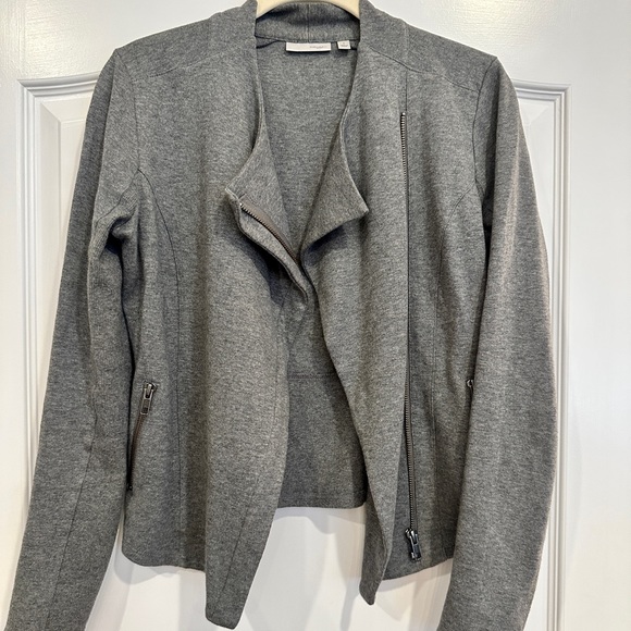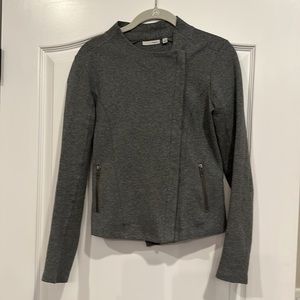 Look sharp and feel comfortable at the same time in this soft sweatshirt-material fitted jacket. Zippers up left side. 2 front zipper pockets. Length hits right at waist. Barely worn. Would fit great if you are an XS too.