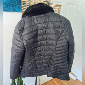 2 in 1 jacket - reversible! Either wear it as a fake fur jacket or wear it as down feather style. Has pockets on both sides. Warm and stylish! Silver hardware