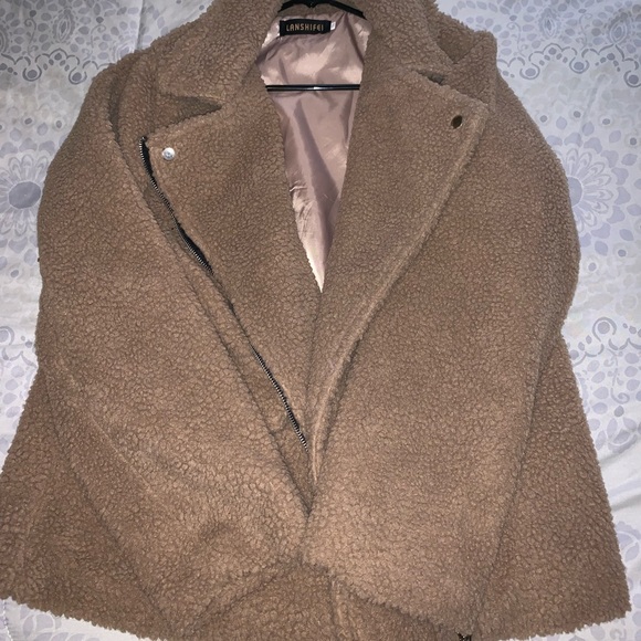 The jacket looks like a cozy teddy bear you want to be wrapped in. The inside have a silk finish so it’s not scratchy. It says XXL but feels more like a L if anything. Never been worn.