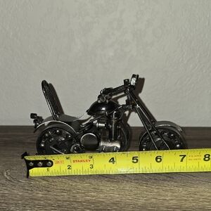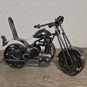 Enhance your decor with this iron motorcycle sculpture. Its sleek silver design adds a modern touch to any space.