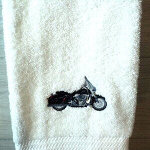 Luxury medium-weight white hand towel with machine-embroidered Harley motorcycle