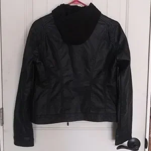 4 pockets, hood doesn't detatch. No flaws. The Brand is CI SONO. not real leather.