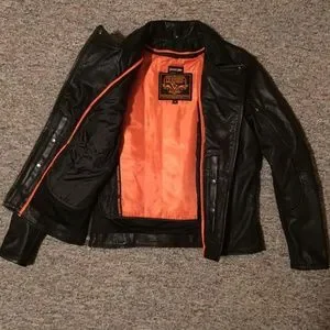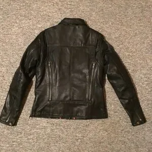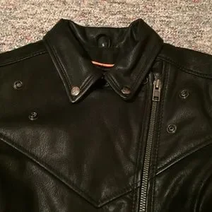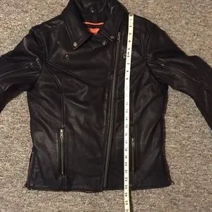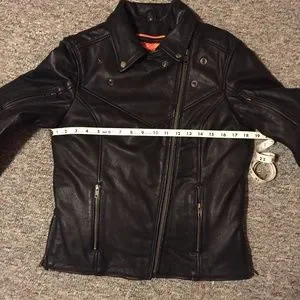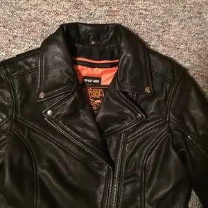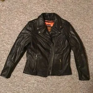 Women’s sturdy leather jacket made for riding. Very comfortable, rarely worn, in like-new condition. Inner pockets as well as outer. Multiple ways to close the collar.