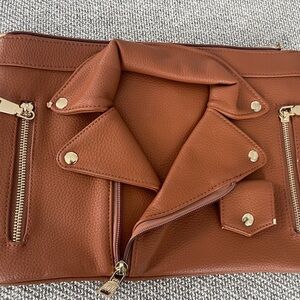 Stylish brown motorcycle jacket front of women's bag with a unique design. Perfect for adding a touch of elegance to any outfit. Great standout piece to add to any collection