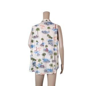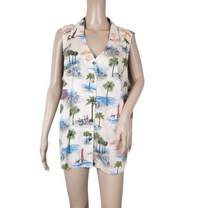 Sleeveless button-up top with a tropical print. Features palm trees and beach scenes in blue, green, and red on a cream background.