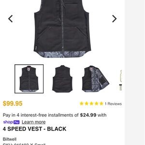 Classic Biltwell 4 Speed vest in black. Heavy-duty construction with a clean, low-profile look. Full front zipper, front hand pockets, and patterned interior lining. Great as a standalone vest or worn under a jacket or over a hoodie—perfect for riding.