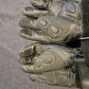 1 pair insulated and armored BMG size XS, 1 pair armored Scorpion leather size SM/8, and 1 pair waterproof HELD size 7s. All three pair are used with slight imperfections but are functional. The leather is pliable since they have been worn. The HELD has one strap that is torn but still functions. The HELD left forefinger has a wipe for helmet visor cleaning while riding. Worn and well loved by a female motorcyclist.