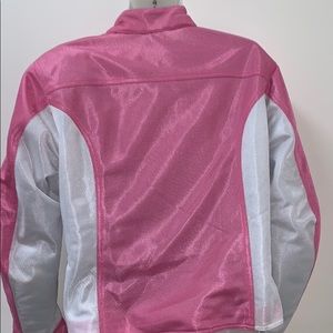 Size Large Pink and white motorcycle jacket. My husband bought it for me but never used it because I’m too scared to go riding with him.