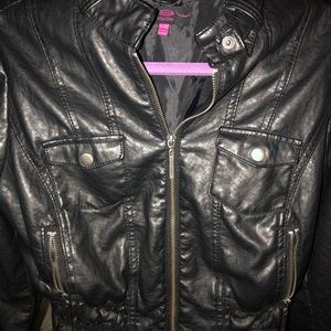 Black jacket with zippers in the front . Scrunched on the waster area . Real pockets on the front . In good condition other than a small rip on the inside armpit area of the softer textile material . Does not affect the actual jacket .