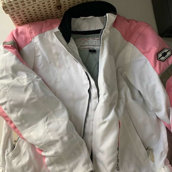 Pink, white and silver ladies’ motorcycle jacket. Size 6-fits like an XS. Slight discoloration of the white just from sun exposure.