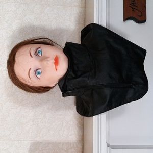 motorcycle neck gator. leather, fleece lined, neck warmer. made in China, zipper closer. length 11 1/2 inches, wide 11 1/2 inches. zipper opening 9 inches. opening around neck is 18 inches. medium