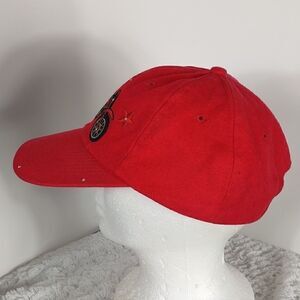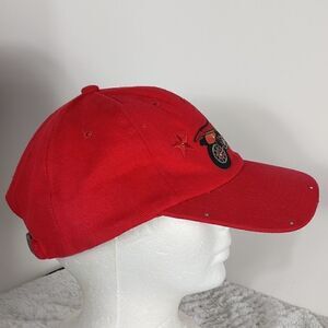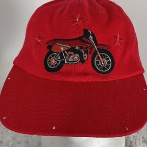 This Nissun red rhinestone studded motorcycle cap is a size one size fits most with an adjustable strap with metal closure. It has a motorcycle on front with rhinestone studding. Pre-owned and in ex condition. All offers welcome.