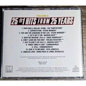 The Motown CD's - 25 #1 Hits From 25 Years Vol 1 & 2 is a 2 CD set featuring various artists and hits from the iconic Motown record label. This collector's edition includes soul, R&B, and soul music from the greatest artists of the era, making it a must-have for any music enthusiast or fan of classic Motown sound.