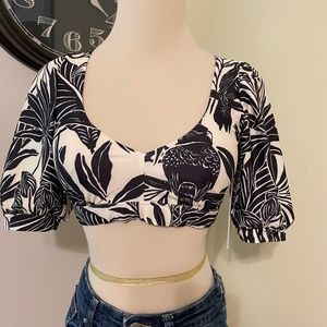 Adorable black and ivory swim top from Mott50- they specialize in UPF swimwear. Fully lined, has bra liner pockets, new with tags. Cute little puff sleeves can take you from pool bar to the beach, very versatile while protecting your delicate shoulders. Could go with any black bottoms! V neck ties in the back for extra customizable fit. The pattern is ivory with black parrots and palm/banana tree leaves. Non smoking home, no cats!
