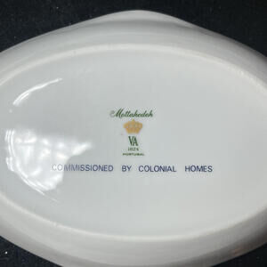 The Mottahedeh Oval Serving Dish is a beautifully crafted piece from Portugal, featuring a bordered design in a classic white color. Made from porcelain and ceramic using majolica production style, this platter exudes elegance and sophistication. The printed backstamp indicates its authenticity, making it a stunning addition to any table setting for serving a variety of dishes with style and grace.
