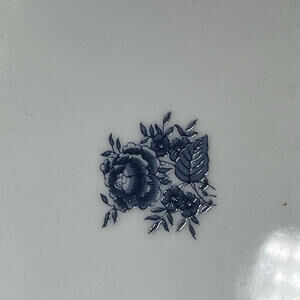 Outlined in blue pattern of crosses and dashes, floral design in center