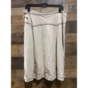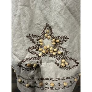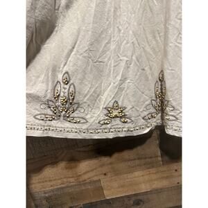 This used Motto women’s blouse features a soft tan color with a delicate floral pattern, designed for size 14. The hi-low hem adds a stylish, flowing silhouette that complements a variety of outfits. Wooden bead accents along the neckline provide a unique and artisanal touch. Lightweight and comfortable, it’s perfect for layering or wearing alone in any season. A versatile and feminine piece ideal for casual or dressy occasions. Great value!!