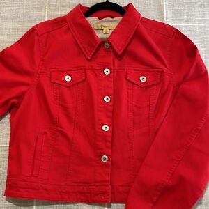 Motto Solid Red Denim Jacket Size L 98% Cotton, 2% Spandex Jacket Size L Detailed measurements available for this item see last pictures.