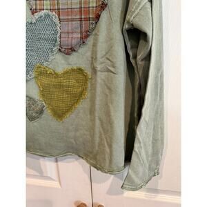 Keywords: Mottoshop, heart patchwork top, long sleeve top, olive green top, distressed top, crew neck top, casual top, boho top, artsy top, unique top, womens top, heart applique, patchwork design, cozy top, relaxed fit, Normcore, Natural, Dainty, Prairie, Coquette