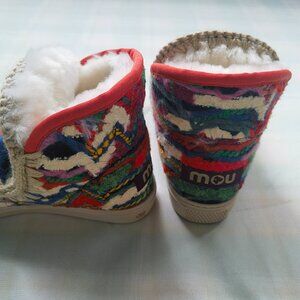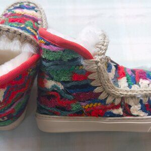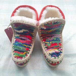 Fleece lining at the opening, rubber sole, featuring signature thick rope stitching and woven fabric with a blend of red, green, and purple textures.