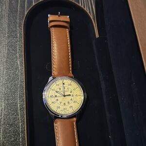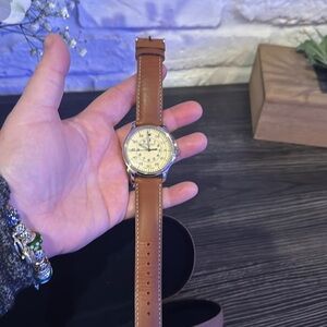 Elegant men’s watch from Mougin & Piquard. Sleek and stylish design. Comes with case. Brown leather strap, contrast stitching, beautiful face.