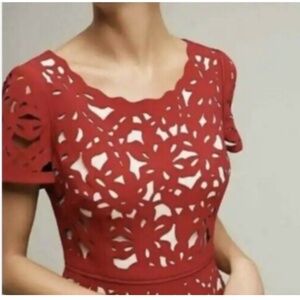 Stunning Anthropologie Moulinette Soeurs laser-cut red fit & flare dress — elegant, structured, and perfect for events or the holidays.