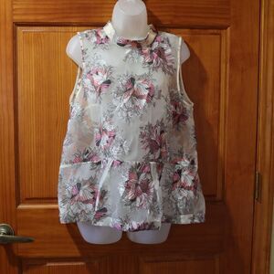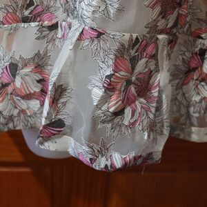 This elegant Moulinette Soeurs blouse blends feminine ruffles with a structured high collar for a striking Anthropologie look. Designed in soft pink and cream tones, the peplum waist and delicate detailing make it perfect for layering at work, date nights, or special occasions. Though originally sold with a cami slip, it’s missing that piece, but interior snaps will easily secure any cami you add. A polished, versatile top that elevates any outfit.