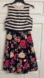 This dress combines a structured striped vest-style top with a flowing floral pleated skirt for a balanced and professional look. The midi length adds versatility.
