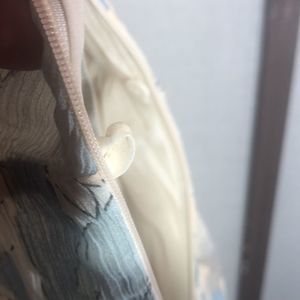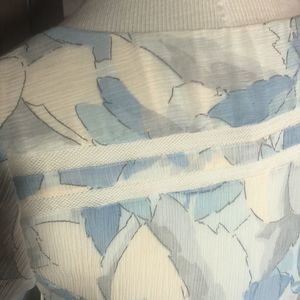 Cream and blue impressionistic leaves pattern and the fabric is textured with fine raised lines