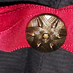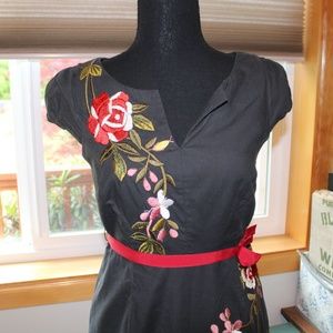 Moulinette Soeurs "Lucillie" Shift Dress. An unusual Moulinette Soeurs for Anthropologie, this dark grey dress hits right below the knee, has cap sleeves, with a red grosgrain ribbon and floral embroidery to create lovely detail as well as the signature lace trim lining. It is a size 0, yet I wear a size 4 and could still wear this dress comfortably. Excellent condition from a smoke free, pet free home.