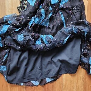 Charming women's dress with a black base and blue geometric accents. Features intricate star patterns on the neckline. Double lined and flowy