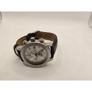 The Mount Royal Convex Round Chronograph Men's watch T-1852W is a stylish timepiece designed for men. Featuring a silver bezel and case with arrow markers on a white dial, this quartz movement watch offers a sporty and casual style. With a chronograph feature, date indicator, and water resistance up to 100m, it is suitable for everyday wear and various activities. The two-piece black leather strap adds a touch of elegance to this wristwatch, making it a versatile accessory for any man's collection.