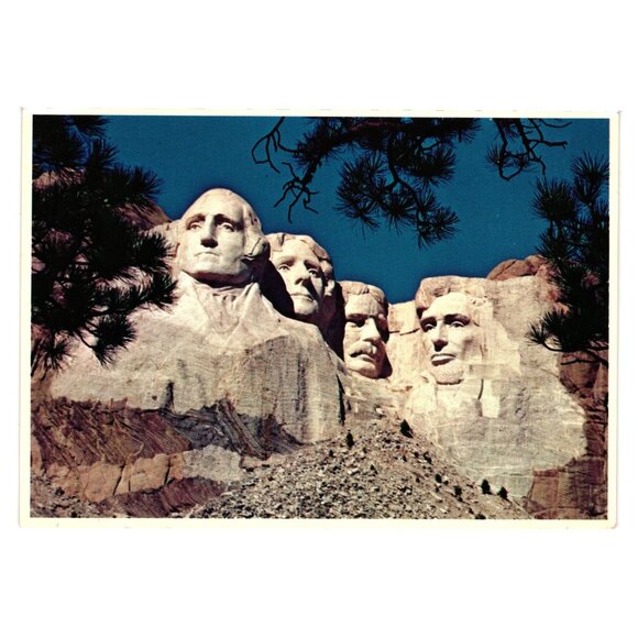 Vintage postcard of Mount Rushmore, showcasing iconic presidential carvings in ageless granite. Ideal collector’s piece or souvenir from Wall Drug in South Dakota.