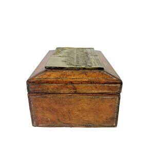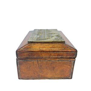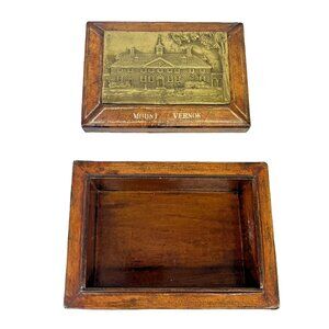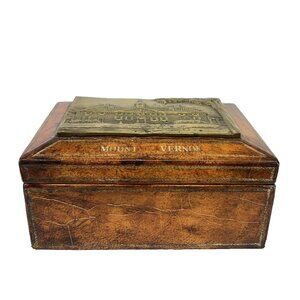 The Mount Vernon Trinket Box features a rectangular shape with a medium size, ideal for all occasions. Made from wood with a brass-plated lid, this patriotic-themed box showcases a 3D effect design, representing American style and heritage. Manufactured in the Philippines during the 1980s, this original Mid 20th Century piece from the Mount Vernon brand exudes an antique brass finish, making it a unique and collectible item for adults interested in American history and decor.