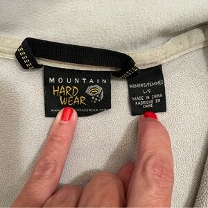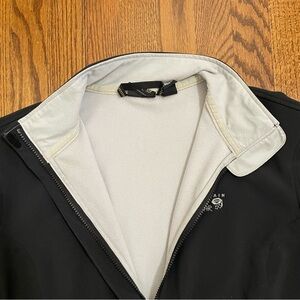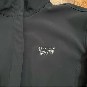 This is a women's Mountain Hard Wear windstopper softshell black zip up jacket. It has side pockets with a zipper. Jacket is a polyester and elastane blend, zips down the front and has a velcro closure at the neck. The jacket is a women's size large. There is one small wear spot on the cuff, please see the last photo.