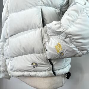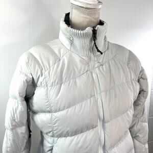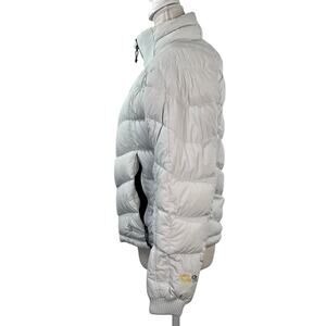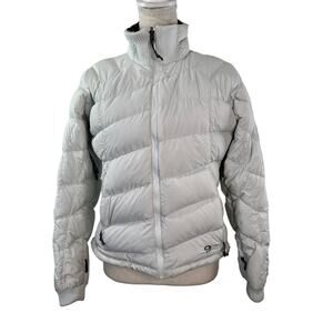Preowned item in excellent overall condition. No odors, stains, or holes. Small flaw shown in photos. Ribbed cuffs & high neck. One interior pocket. Under arm zip vents. Side zip pockets. Hem cinch. Down filled quilting insulation.