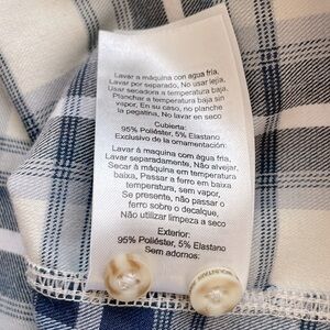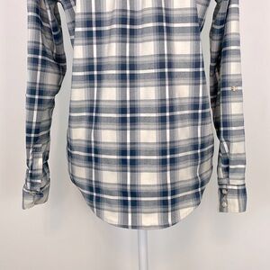 Mountain Hardware blue, gray, off white plaid shirt. Size small. In good preowned condition. No stains or holes. V-neck. Buttons half way down. Pullover. Has a button to shorten the sleeves. Armpit to pit measures 18 inches. Hi lo. Top of shoulder down front 23 inches. Down back 27 inches. Comes from a smoke free home.